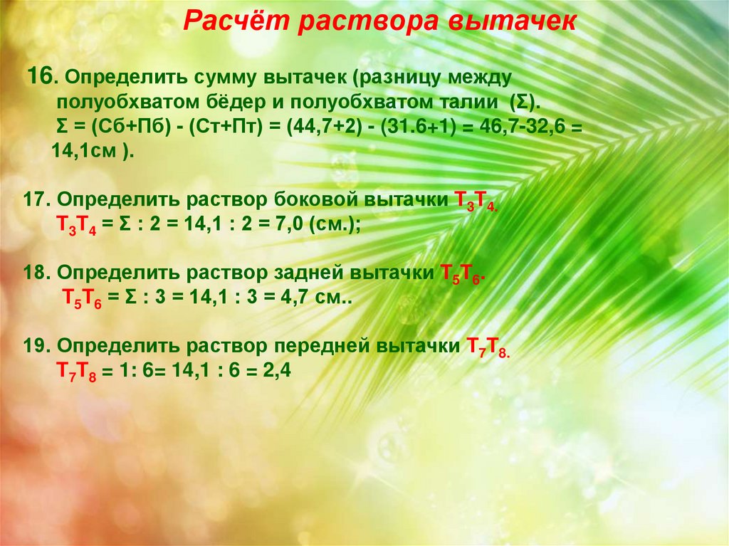 Расчёт раствора вытачек16. Определить сумму вытачек (разницу между