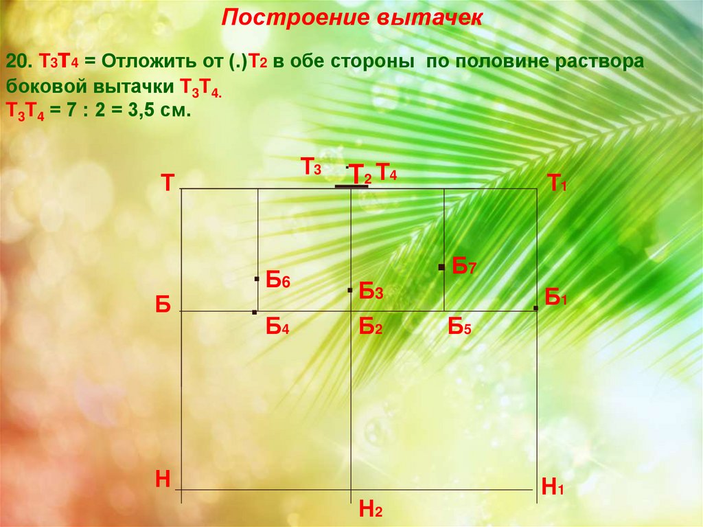21. Т5Т6 = Отложить от осевой линии задней вытачки в обестороны половину раствора задней вытачки ( 4,7 : 2 = 2,35 см )