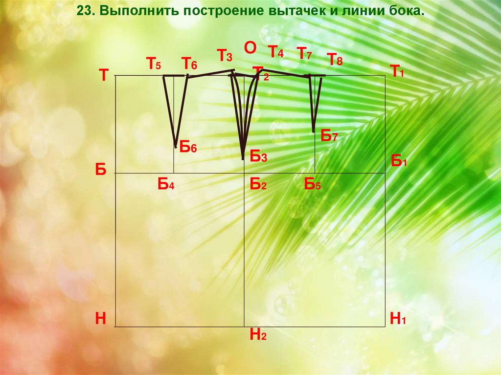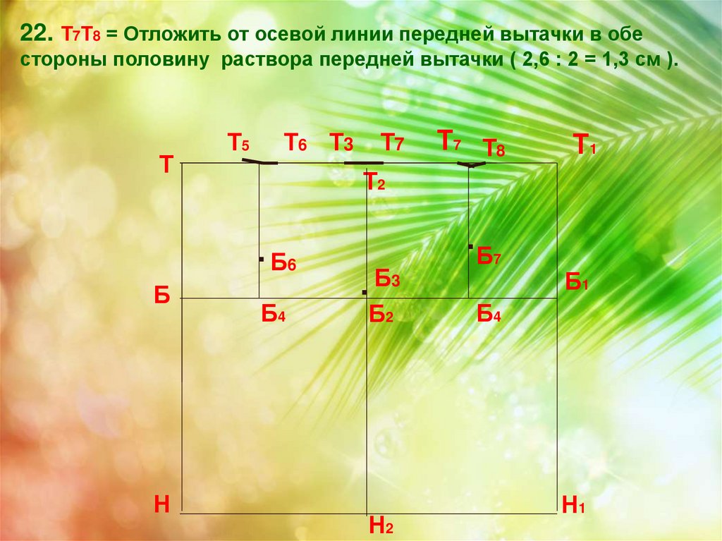 22. Т7Т8 = Отложить от осевой линии передней вытачки в обестороны половину раствора передней вытачки ( 2,6 : 2 = 1,3 см ).