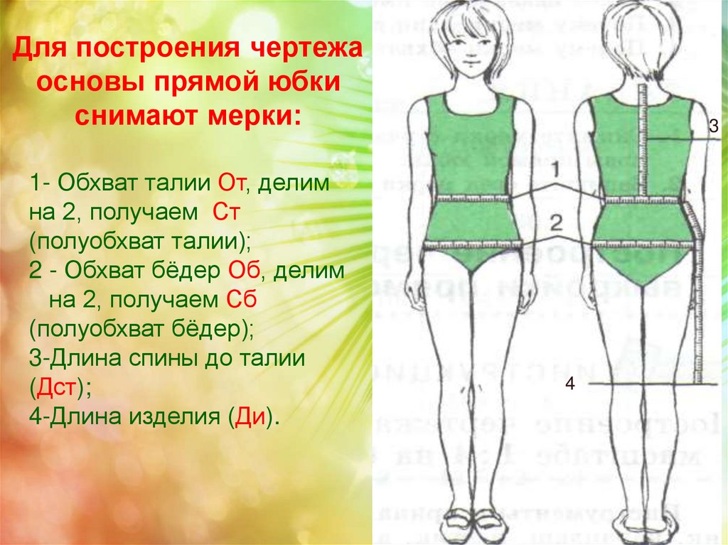 Чертеж выполняют на правую половину фигуры, поэтому мерки обхватовзаписывают в половинном размере. Мерки длин записывают полностью.