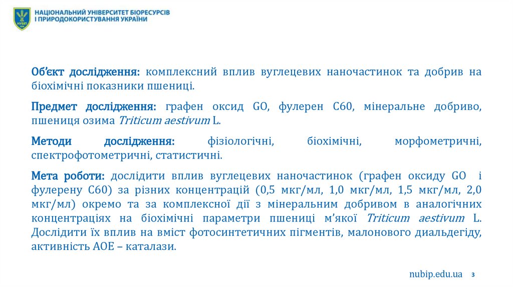 Предмет дослідження: графен оксид GO, фулерен С60, мінеральне добриво,