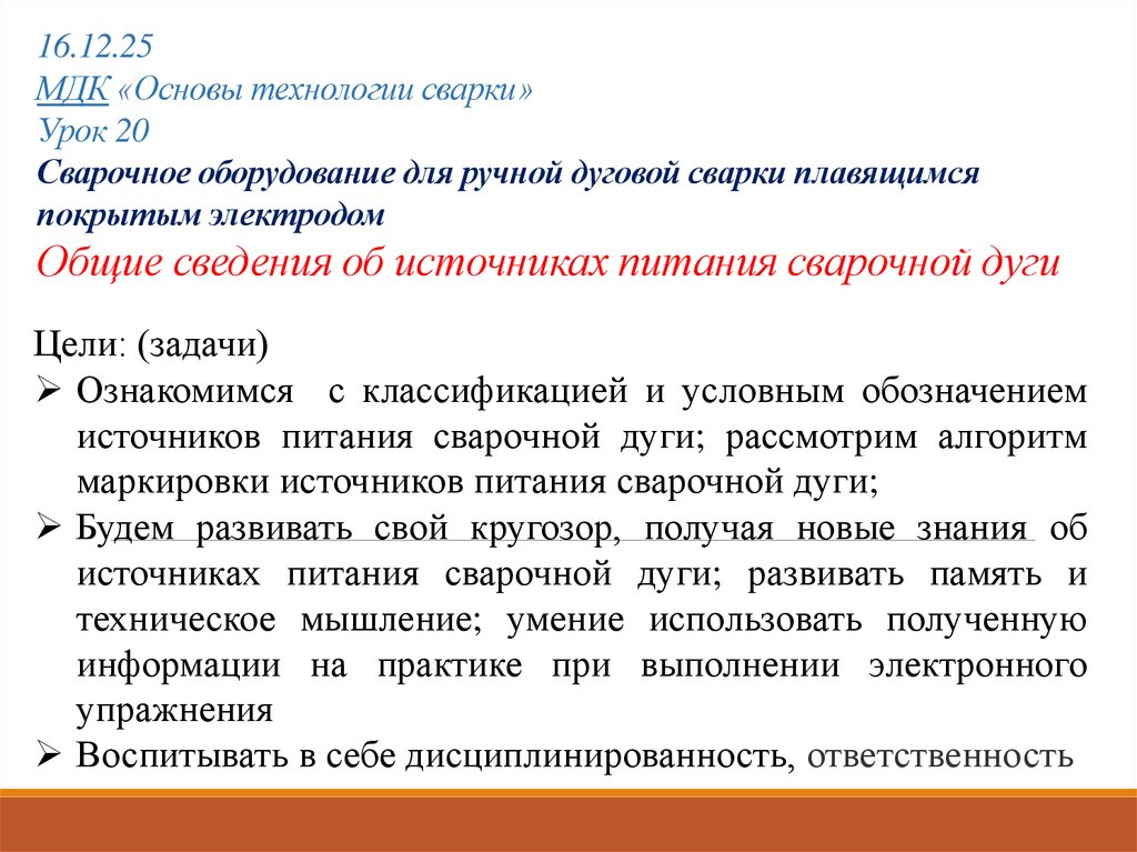 1. 16.12.25 МДК «Основы технологии сварки» Урок 20 Сварочное оборудование для ручной дуговой сварки плавящимся покрытым электродом