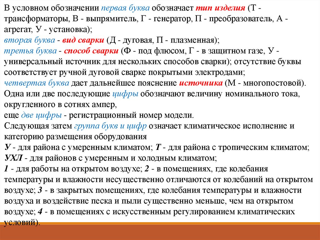 В условном обозначении первая буква обозначает тип изделия (Т трансформаторы, В - выпрямитель, Г - генератор, П - преобразователь, А агрегат, У - установка);вторая буква - вид сварки (Д - дуговая, П - плазменная);