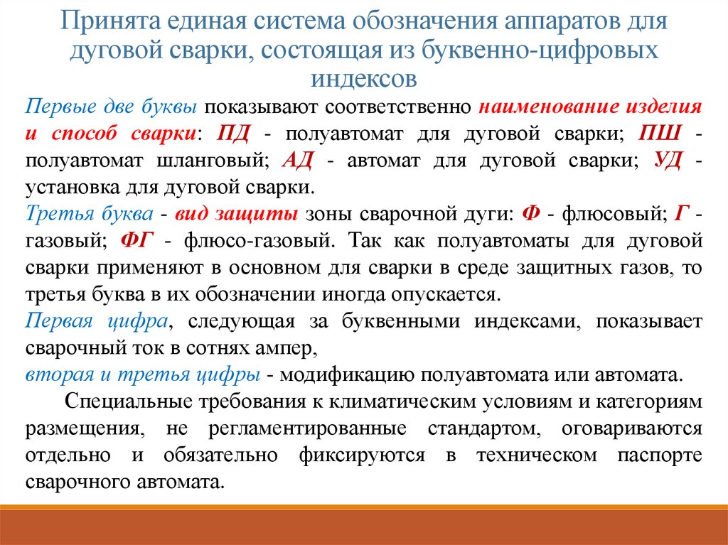 Принята единая система обозначения аппаратов длядуговой сварки, состоящая из буквенно-цифровых