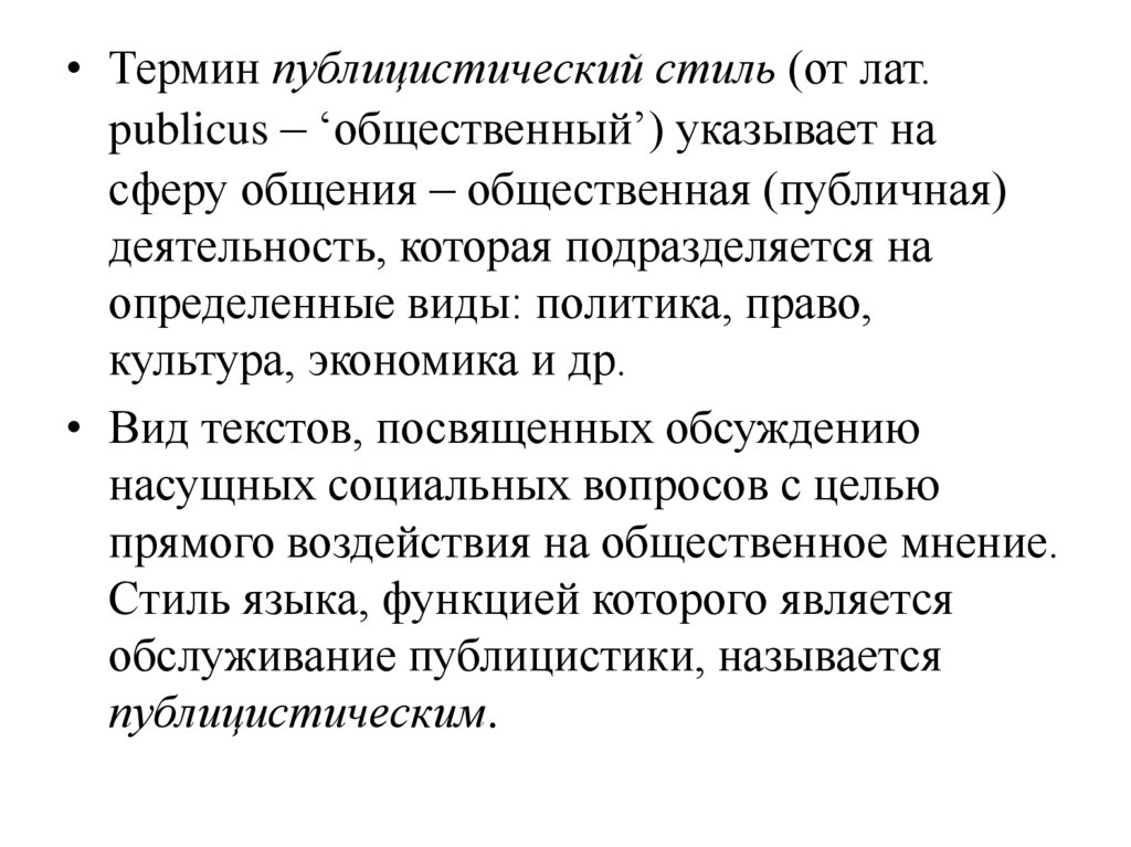 • Термин публицистический стиль (от лат.publicus – ‘общественный’) указывает на