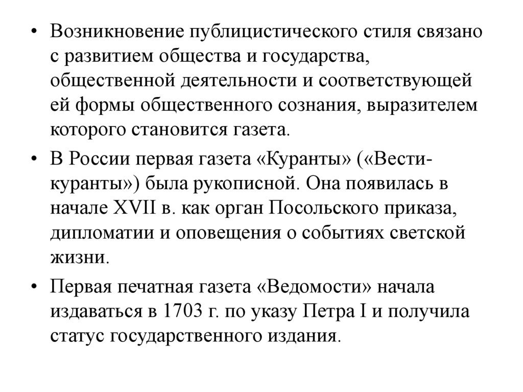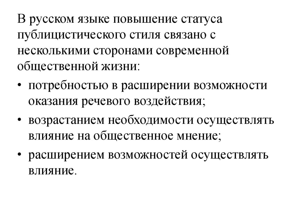 • Возникновение публицистического стиля связанос развитием общества и государства,
