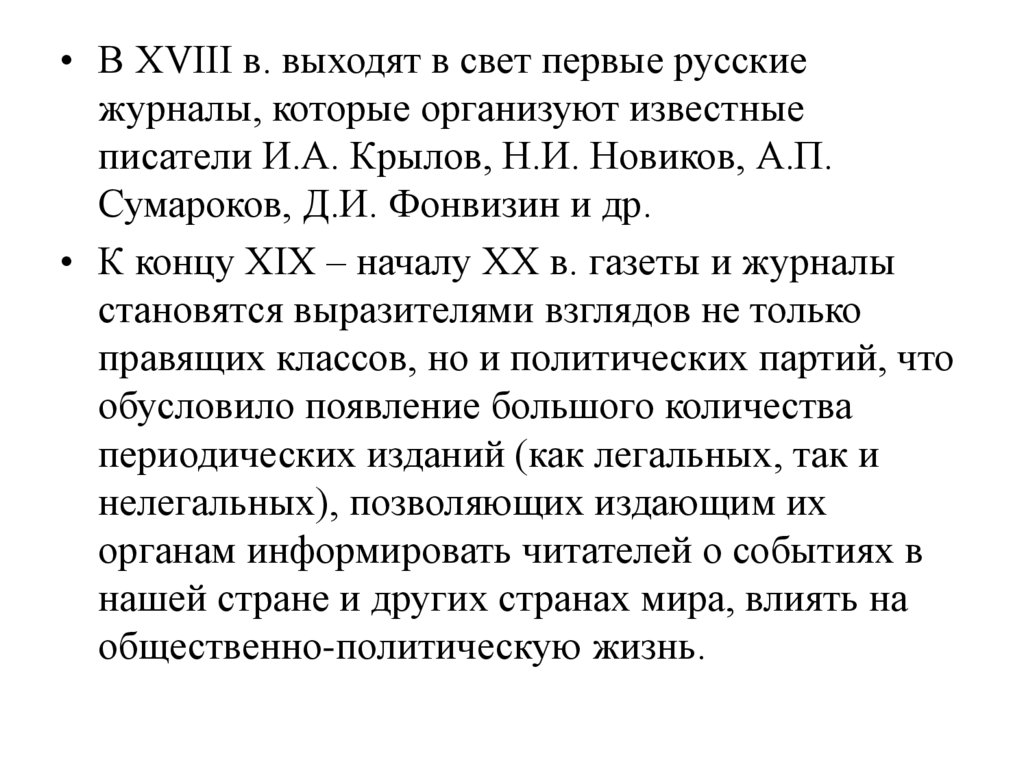 • В XVIII в. выходят в свет первые русскиежурналы, которые организуют известные