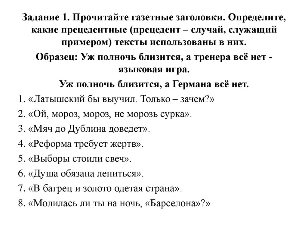 Задание 1. Прочитайте газетные заголовки. Определите,какие прецедентные (прецедент – случай, служащий