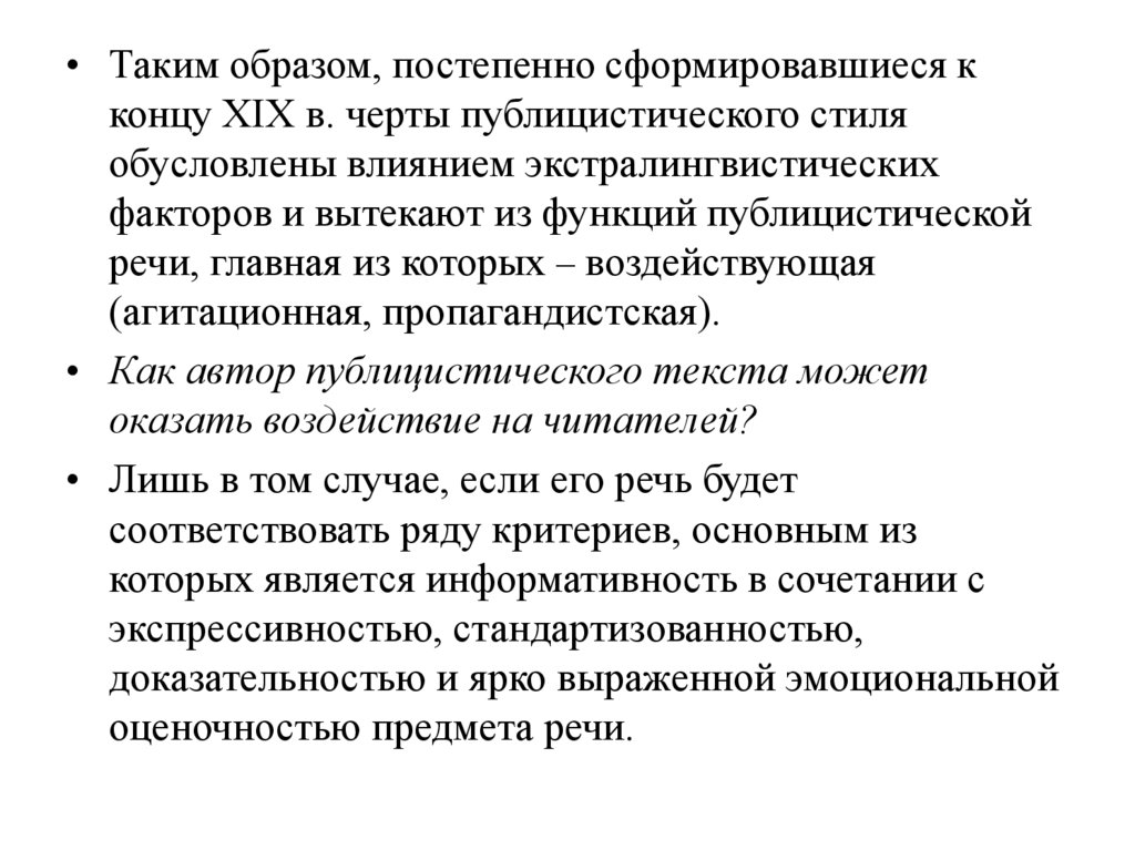 • Таким образом, постепенно сформировавшиеся кконцу XIX в. черты публицистического стиля