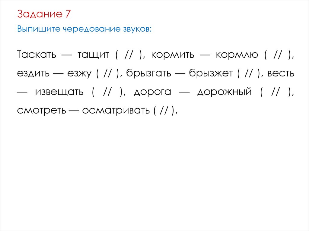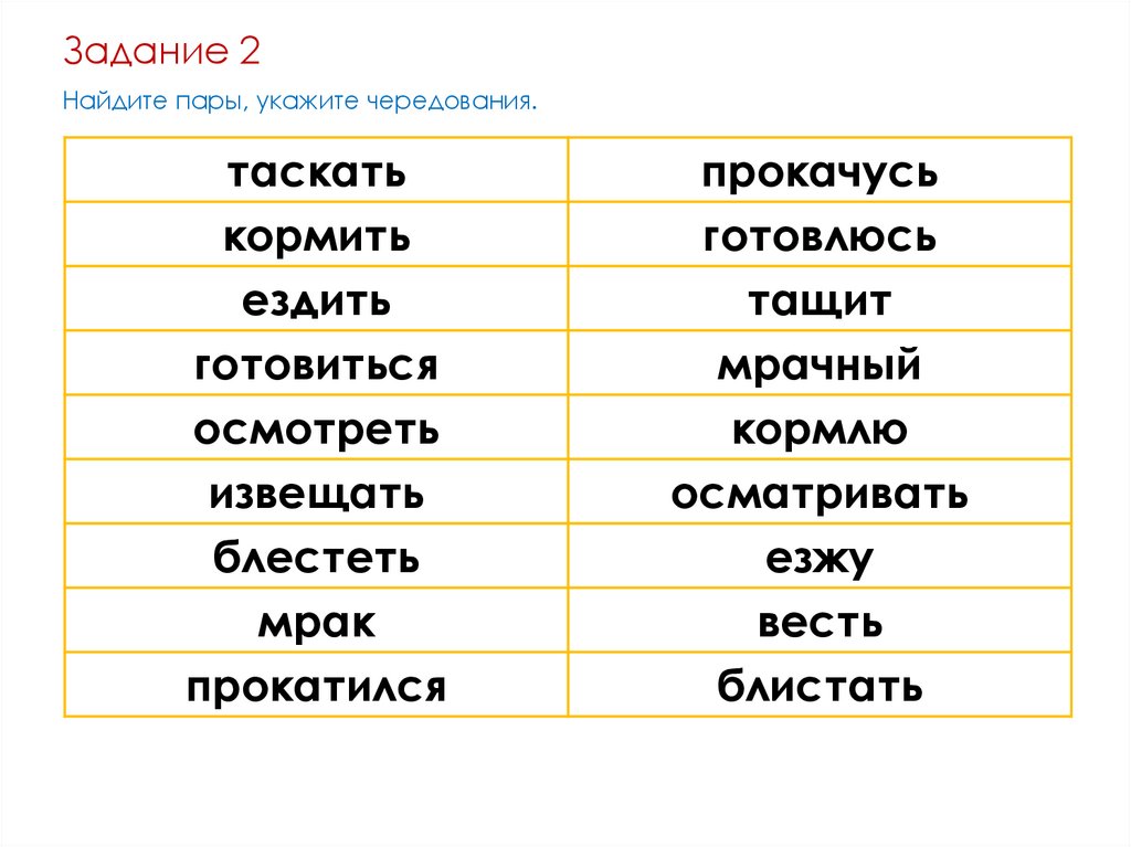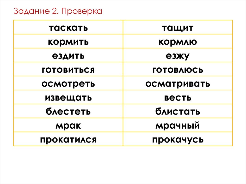 Таскать — тащит ( // ), кормить — кормлю ( // ),