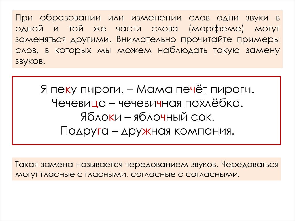 При образовании или изменении слов одни звуки водной и той же части слова (морфеме) могут