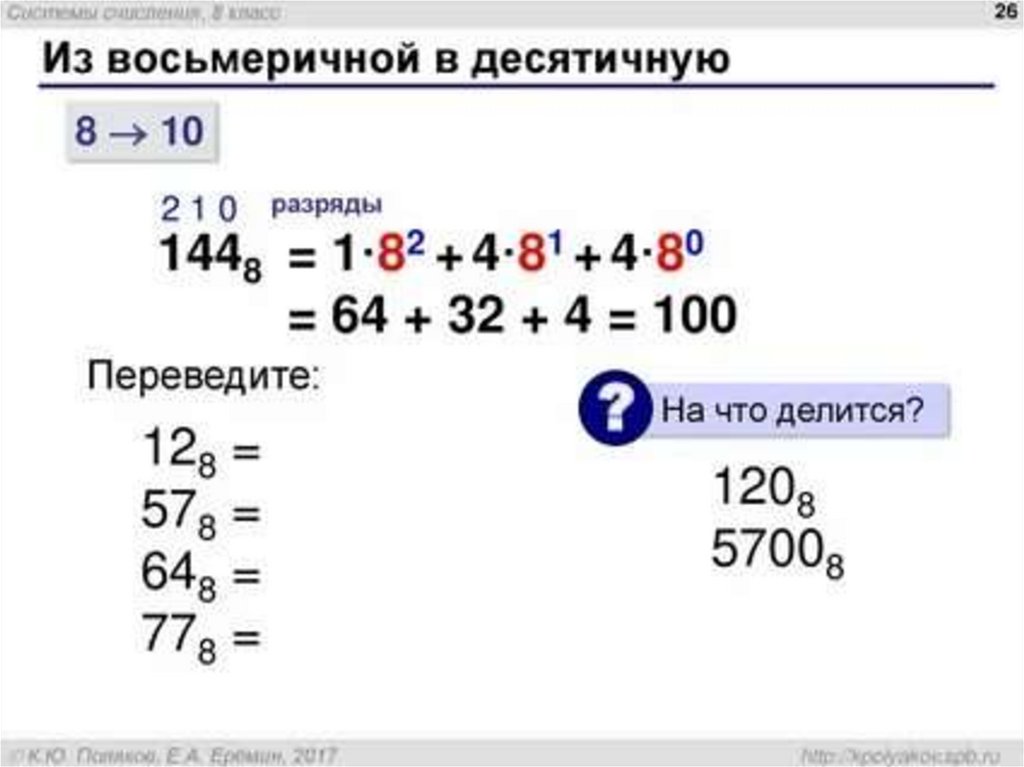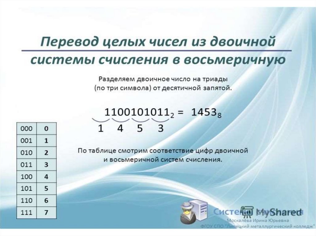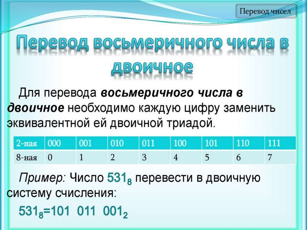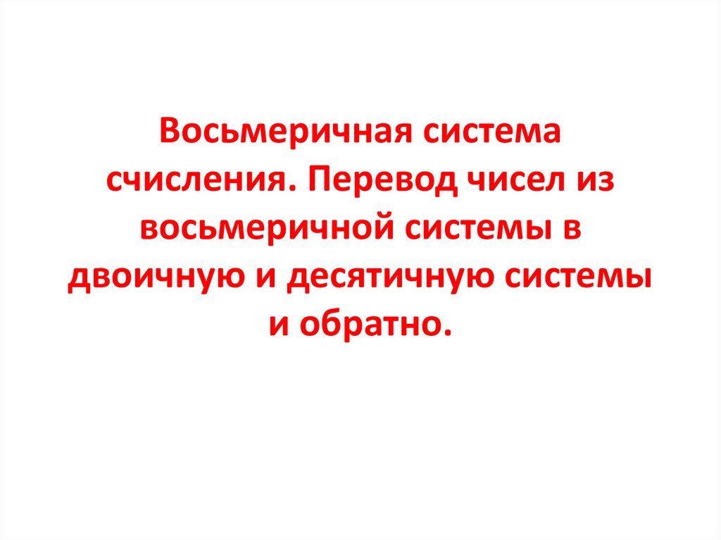 1. Восьмеричная система счисления. Перевод чисел из восьмеричной системы в двоичную и десятичную системы и обратно.