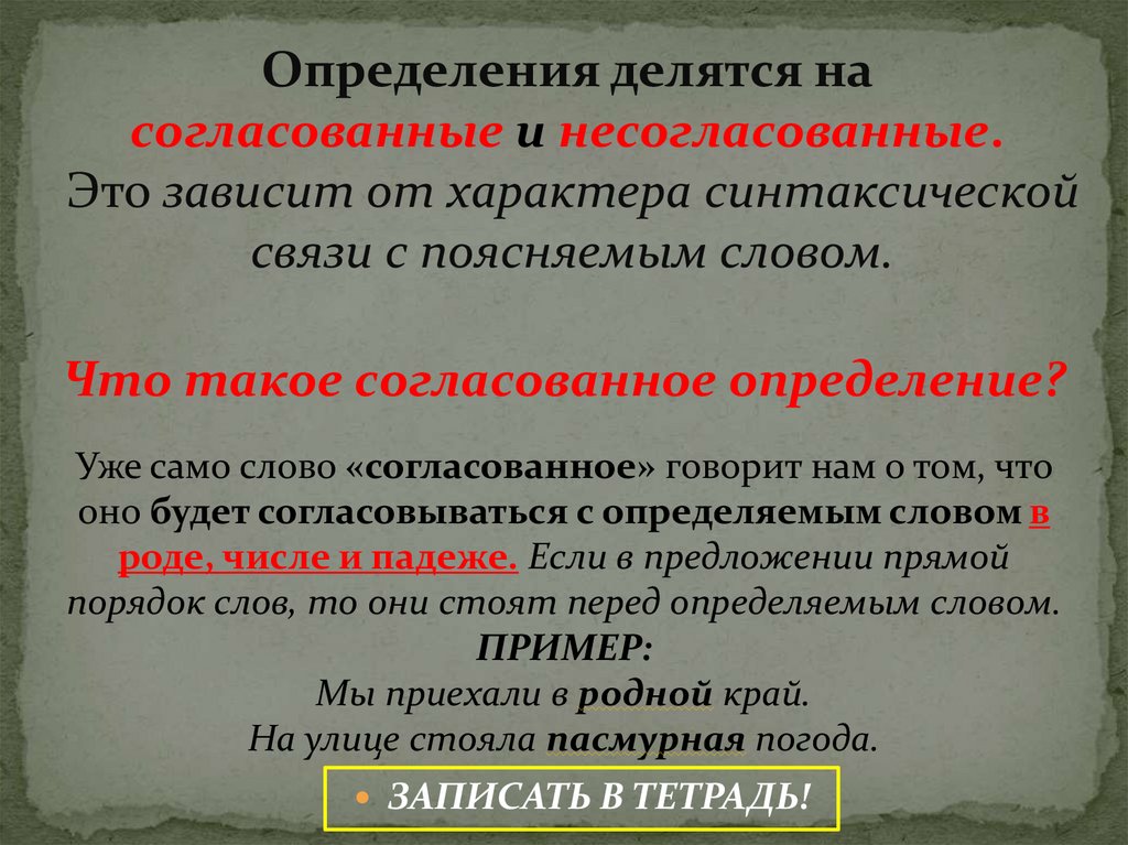 Определения делятся насогласованные и несогласованные.