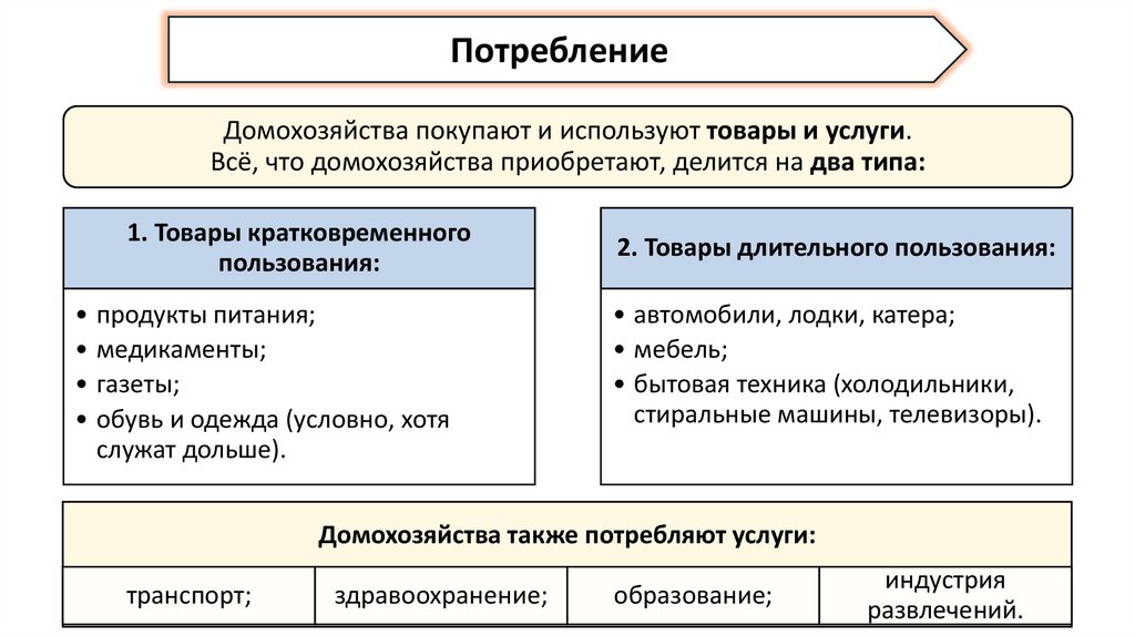 ПотреблениеДомохозяйства покупают и используют товары и услуги.