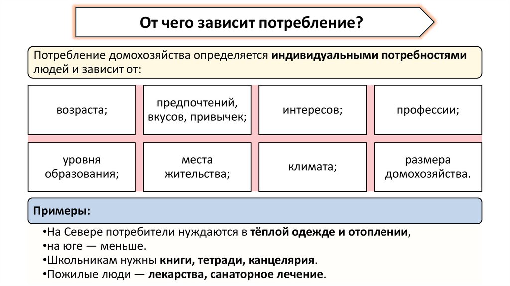 От чего зависит потребление?Потребление домохозяйства определяется индивидуальными потребностями