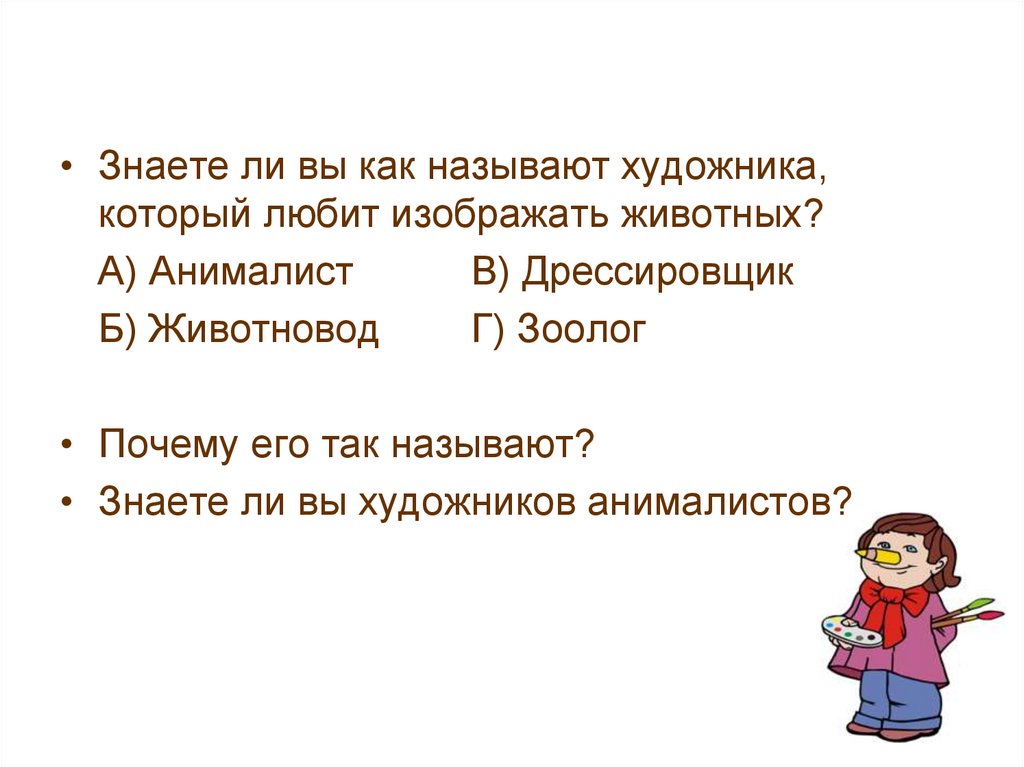 • Знаете ли вы как называют художника,который любит изображать животных?