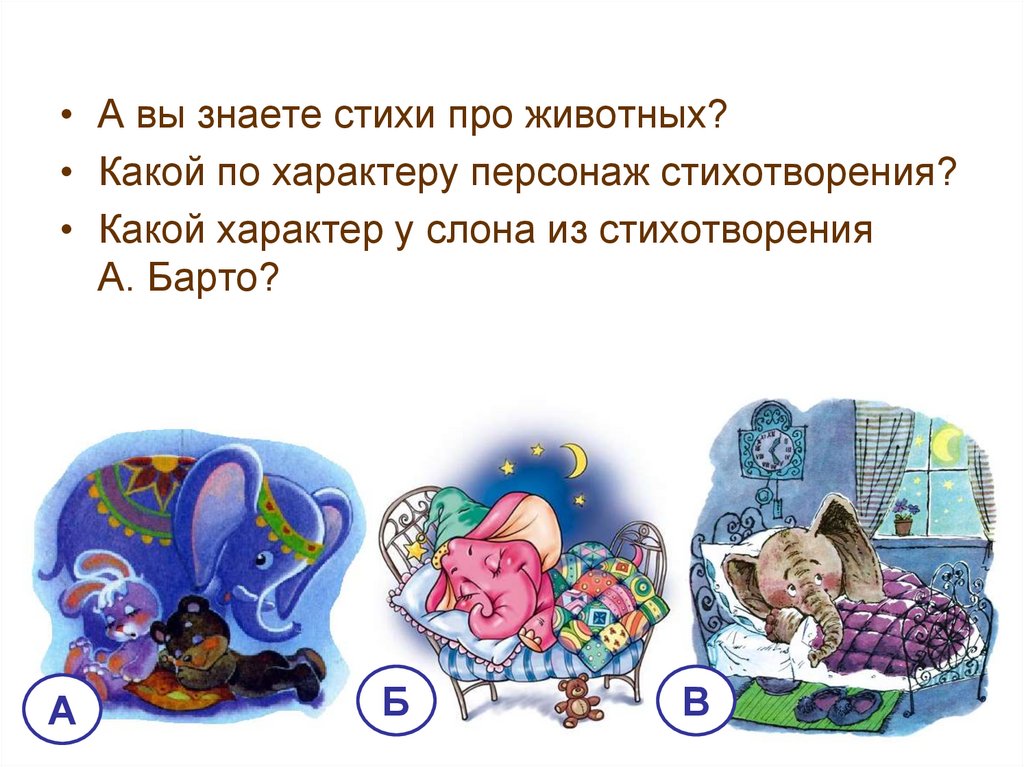 • А вы знаете стихи про животных?• Какой по характеру персонаж стихотворения?