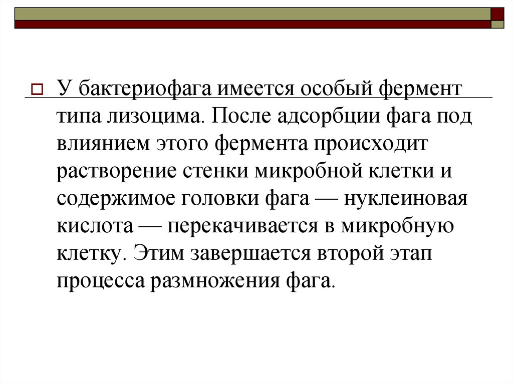 У бактериофага имеется особый ферменттипа лизоцима. После адсорбции фага под