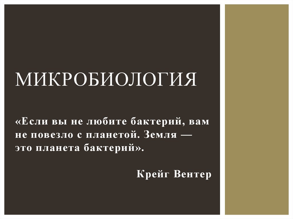 1. МИКРОБИОЛОГИЯ «Если вы не любите бактерий, вам не повезло с планетой. Земля — это планета бактерий». Крейг Вентер