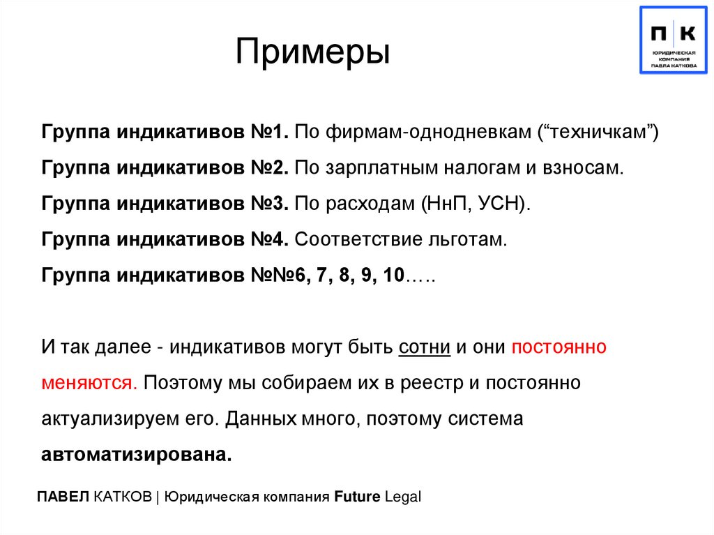 ПримерыГруппа индикативов №1. По фирмам-однодневкам (“техничкам”)