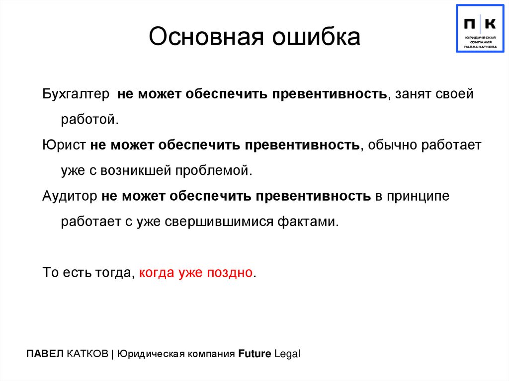 Основная ошибкаБухгалтер не может обеспечить превентивность, занят своей