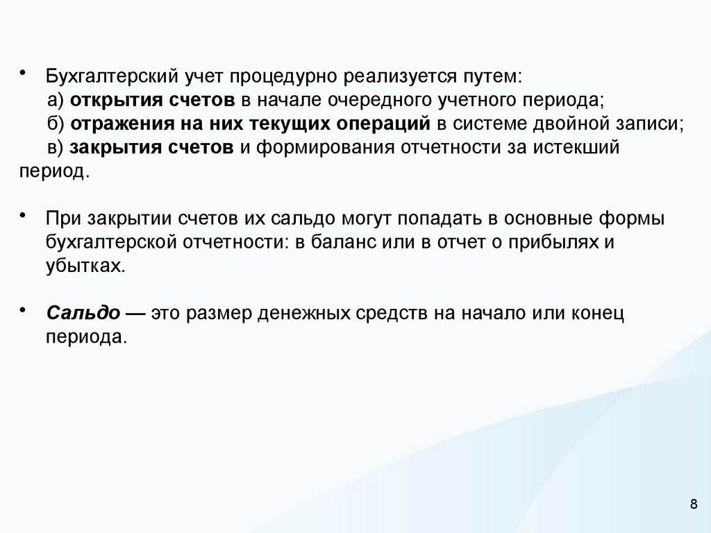 • Бухгалтерский учет процедурно реализуется путем:а) открытия счетов в начале очередного учетного периода;