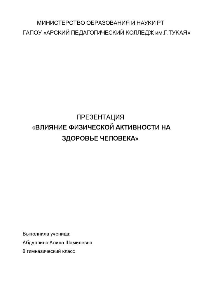 МИНИСТЕРСТВО ОБРАЗОВАНИЯ И НАУКИ РТГАПОУ «АРСКИЙ ПЕДАГОГИЧЕСКИЙ КОЛЛЕДЖ им.Г.ТУКАЯ»