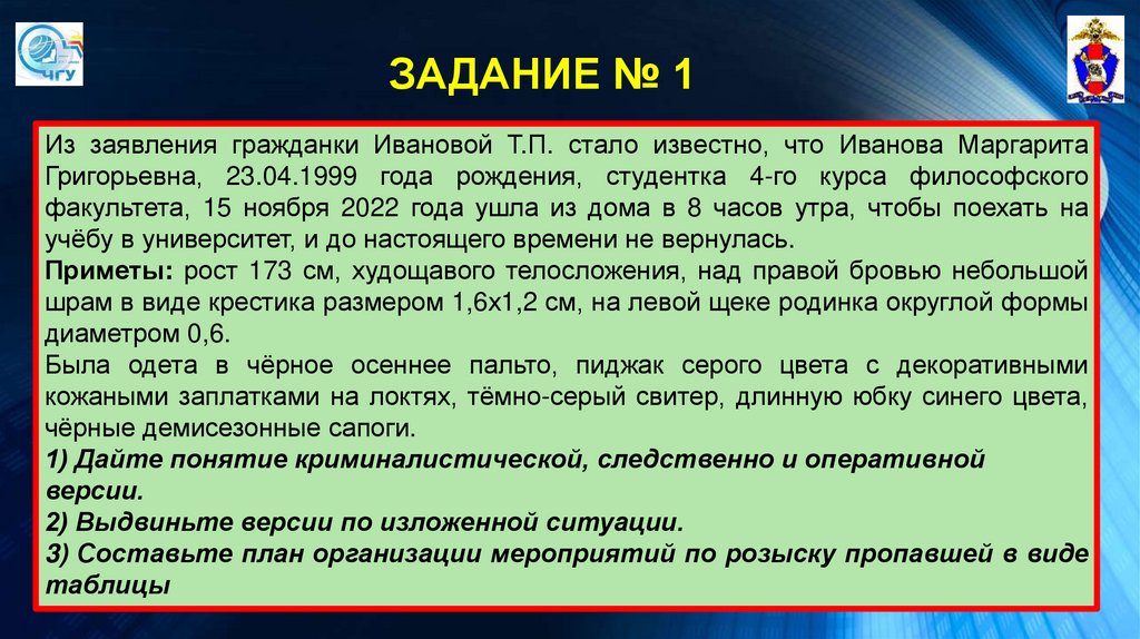 ЗАДАНИЕ № 1Из заявления гражданки Ивановой Т.П. стало известно, что Иванова Маргарита