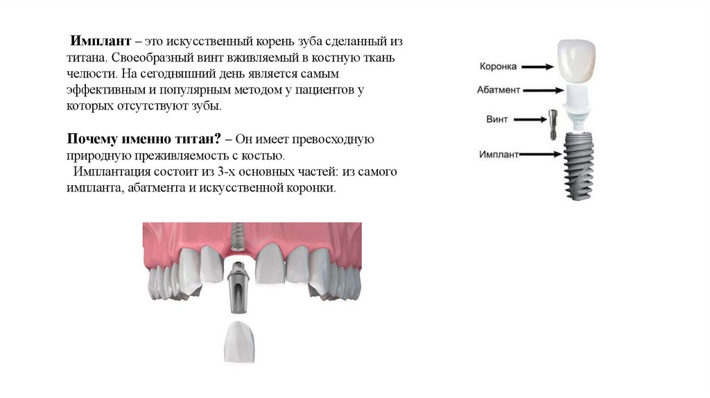 Имплант – это искусственный корень зуба сделанный изтитана. Своеобразный винт вживляемый в костную ткань