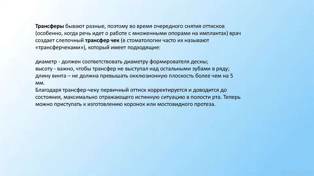 Трансферы бывают разные, поэтому во время очередного снятия оттисков(особенно, когда речь идет о работе с множенными опорами на имплантах) врач