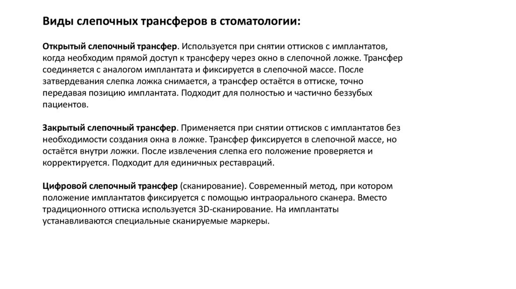 Виды слепочных трансферов в стоматологии:Открытый слепочный трансфер. Используется при снятии оттисков с имплантатов,