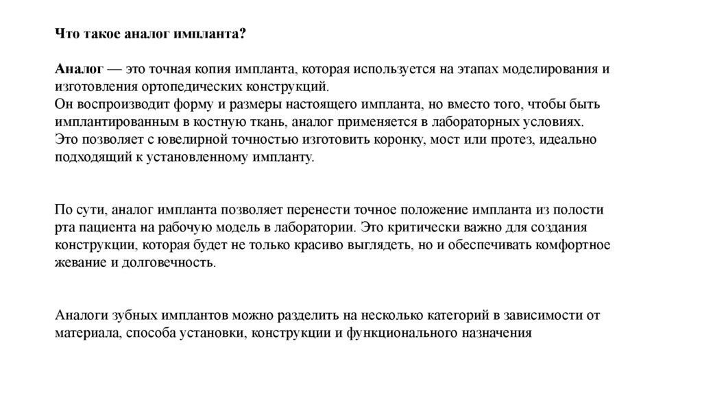 Что такое аналог импланта?Аналог — это точная копия импланта, которая используется на этапах моделирования и