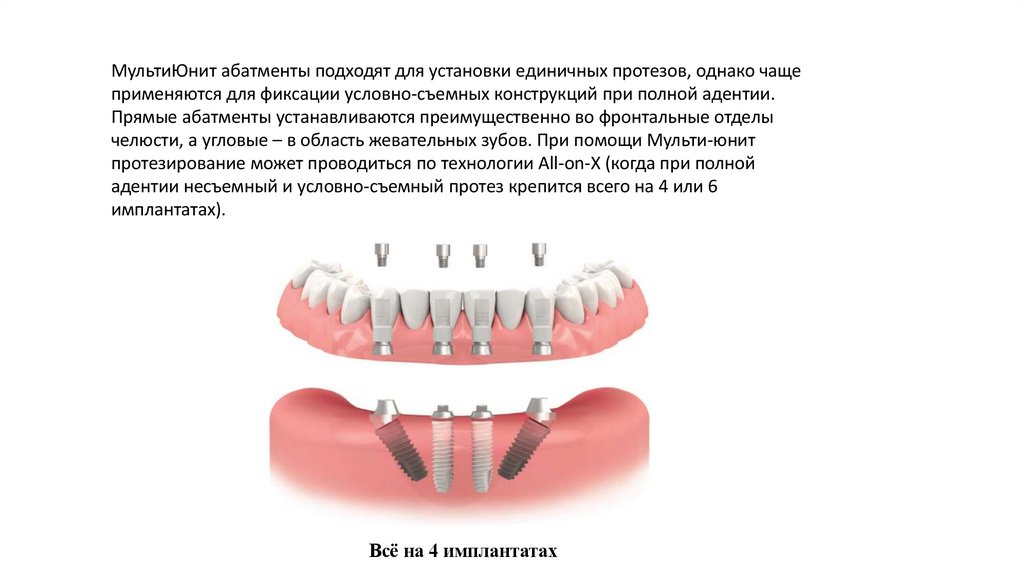 МультиЮнит абатменты подходят для установки единичных протезов, однако чащеприменяются для фиксации условно-съемных конструкций при полной адентии.