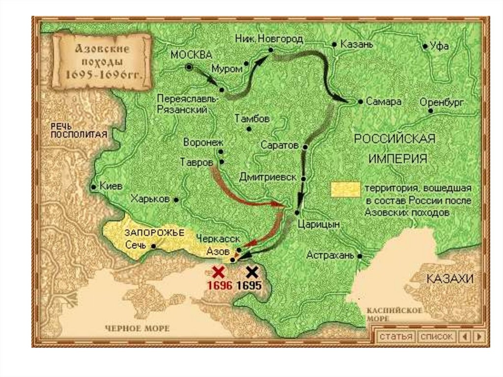 1\ Азовские походы 1695г. (взять Азов, выйти в Азовское море, 3 мес.,нет флота, артиллерии, нет единого командования)