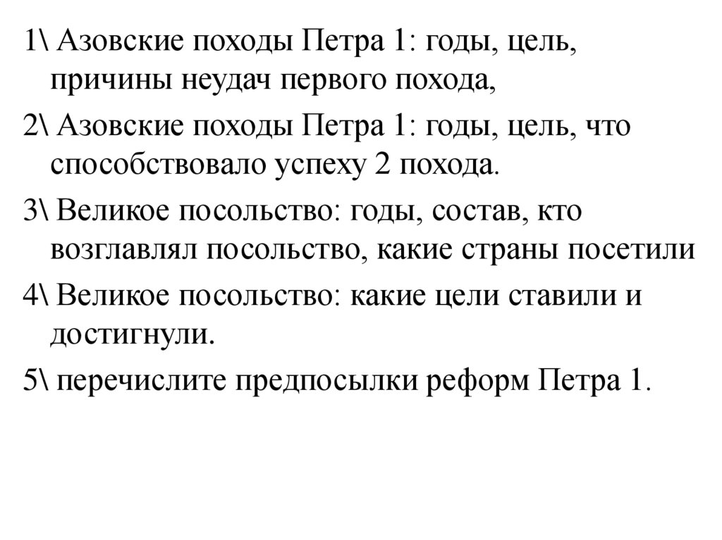 1\ Азовские походы Петра 1: годы, цель,причины неудач первого похода,