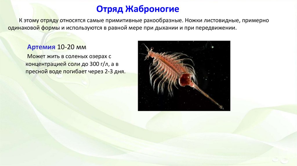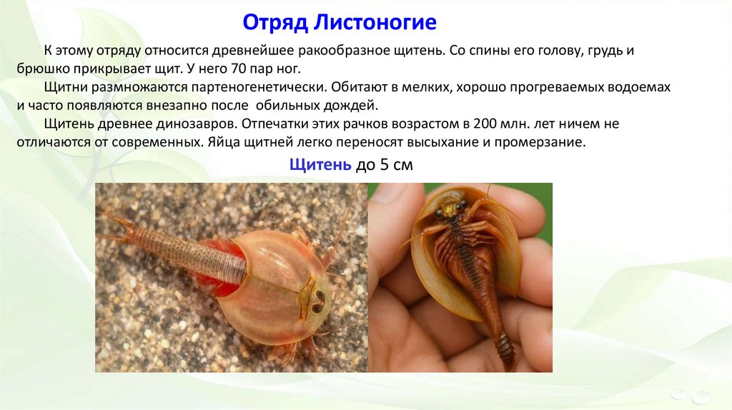 Отряд ЛистоногиеК этому отряду относится древнейшее ракообразное щитень. Со спины его голову, грудь и