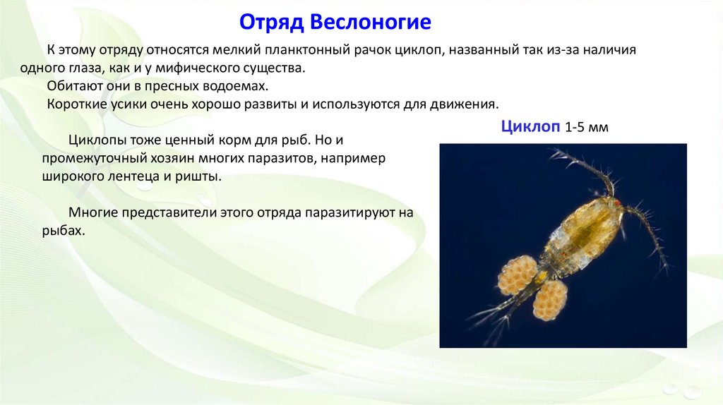 Отряд ВеслоногиеК этому отряду относятся мелкий планктонный рачок циклоп, названный так из-за наличия