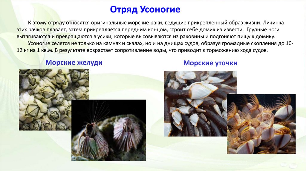Отряд УсоногиеК этому отряду относятся оригинальные морские раки, ведущие прикрепленный образ жизни. Личинка
