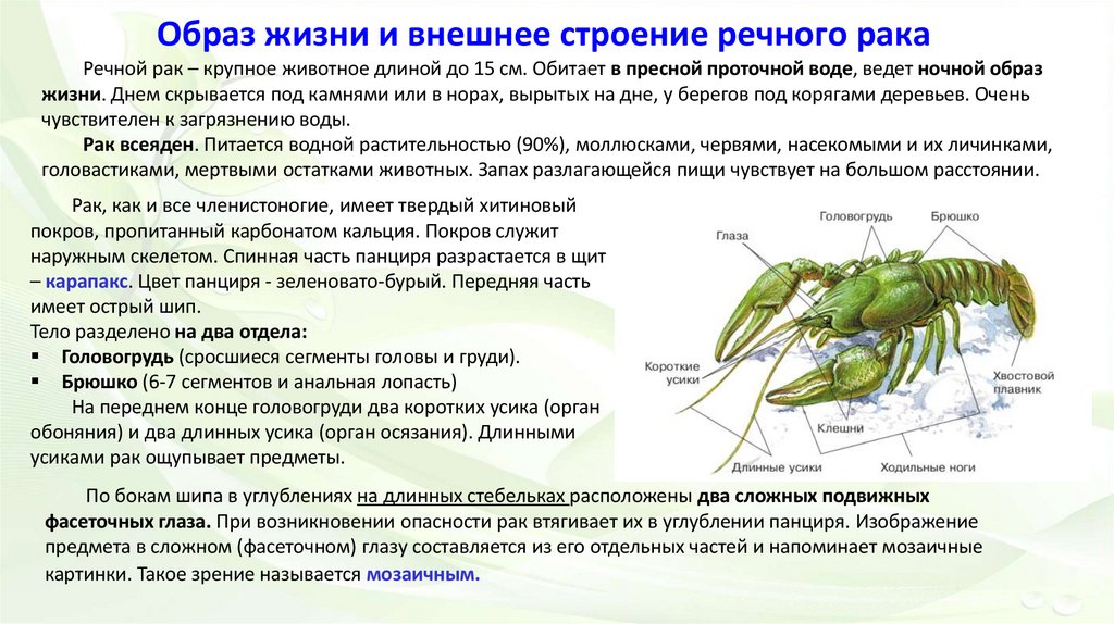 Образ жизни и внешнее строение речного ракаРечной рак – крупное животное длиной до 15 см. Обитает в пресной проточной воде, ведет ночной образ