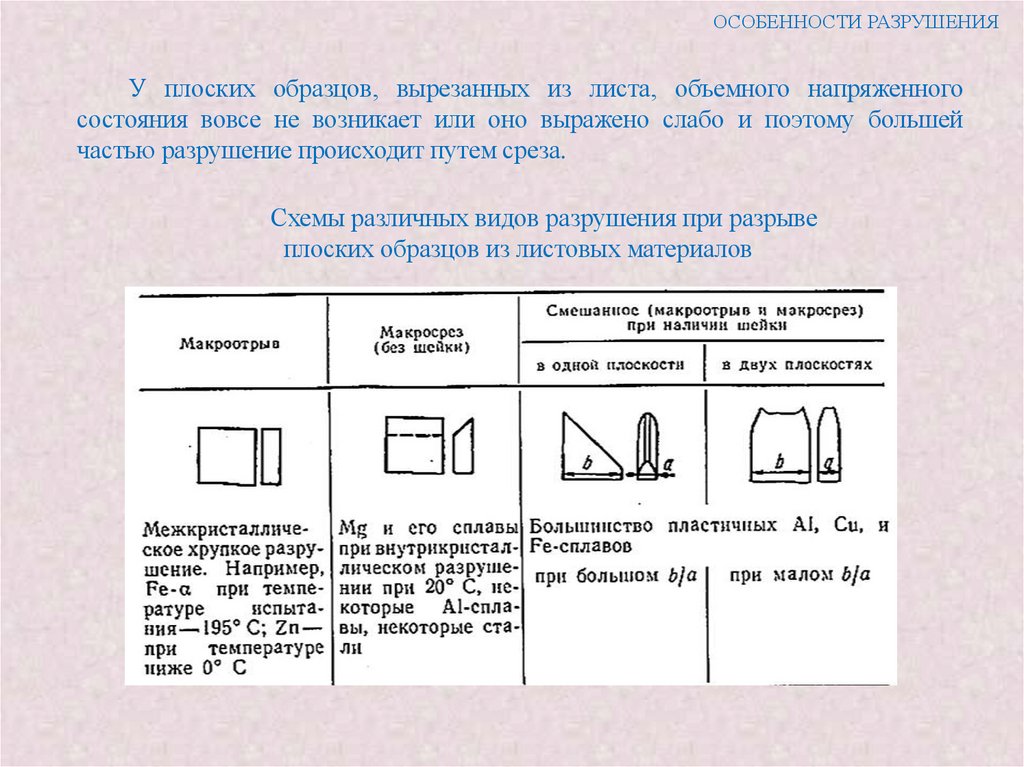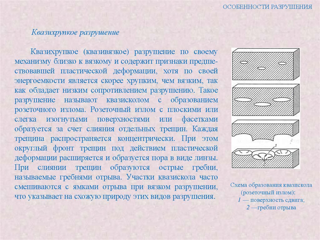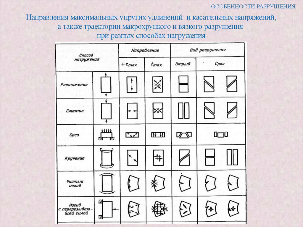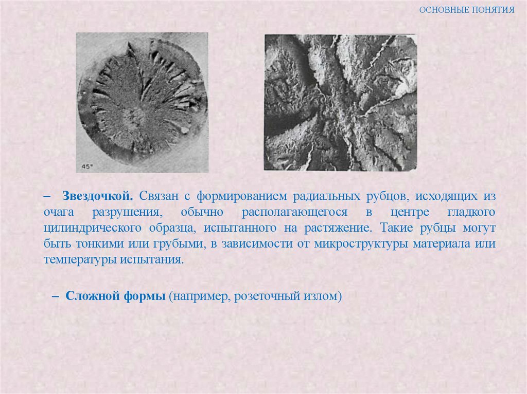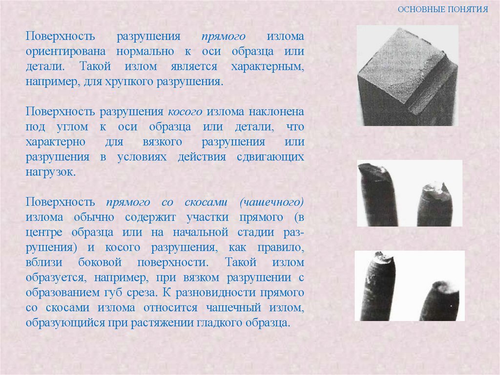 центре образца или на начальной стадии разрушения) и косого разрушения, как правило,