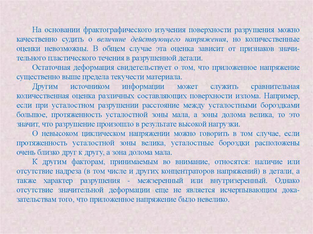 На основании фрактографического изучения поверхности разрушения можнокачественно судить о величине действующего напряжения, но количественные