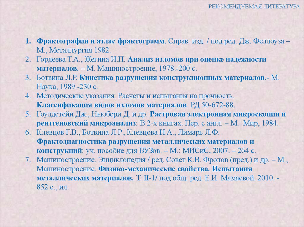 РЕКОМЕНДУЕМАЯ ЛИТЕРАТУРА1. Фрактография и атлас фрактограмм. Справ. изд. / под ред. Дж. Феллоуза –