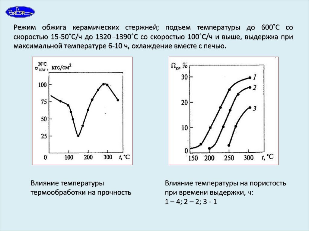 Режим обжига керамических стержней; подъем температуры до 600˚C соскоростью 15-50˚C/ч до 1320 1390˚C со скоростью 100˚C/ч и выше, выдержка при