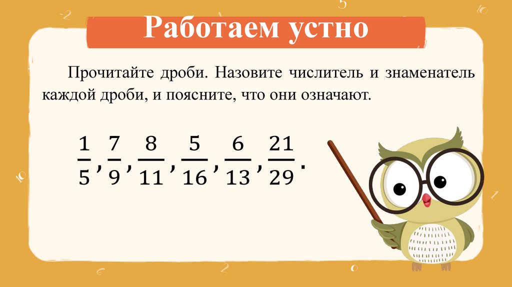 Работаем устноПрочитайте дроби. Назовите числитель и знаменатель