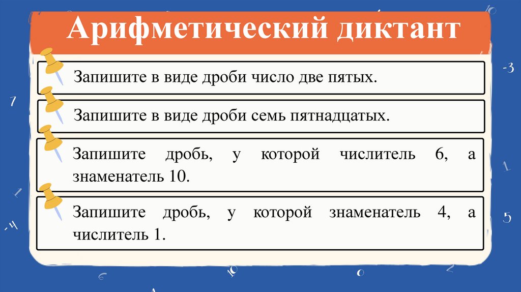 Арифметический диктантЗапишите в виде дроби число две пятых.