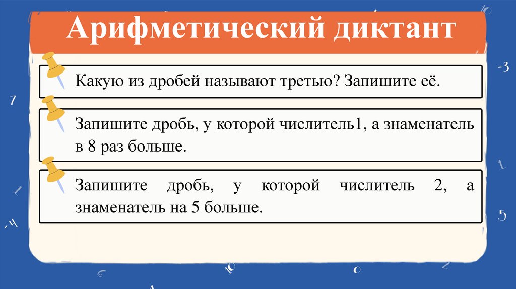 Арифметический диктантКакую из дробей называют третью? Запишите её.