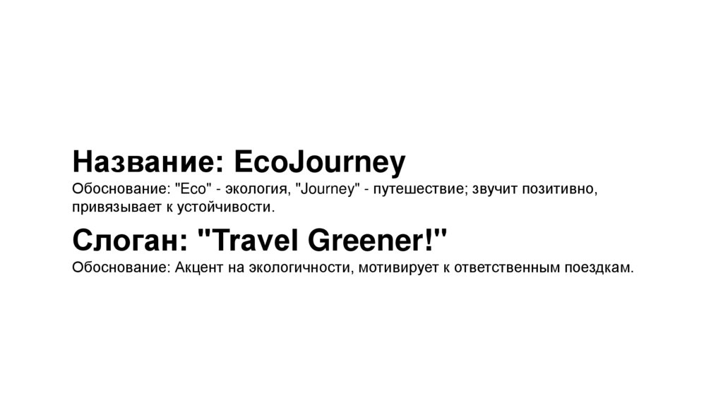 Название: EcoJourneyОбоснование: "Eco" - экология, "Journey" - путешествие; звучит позитивно,
