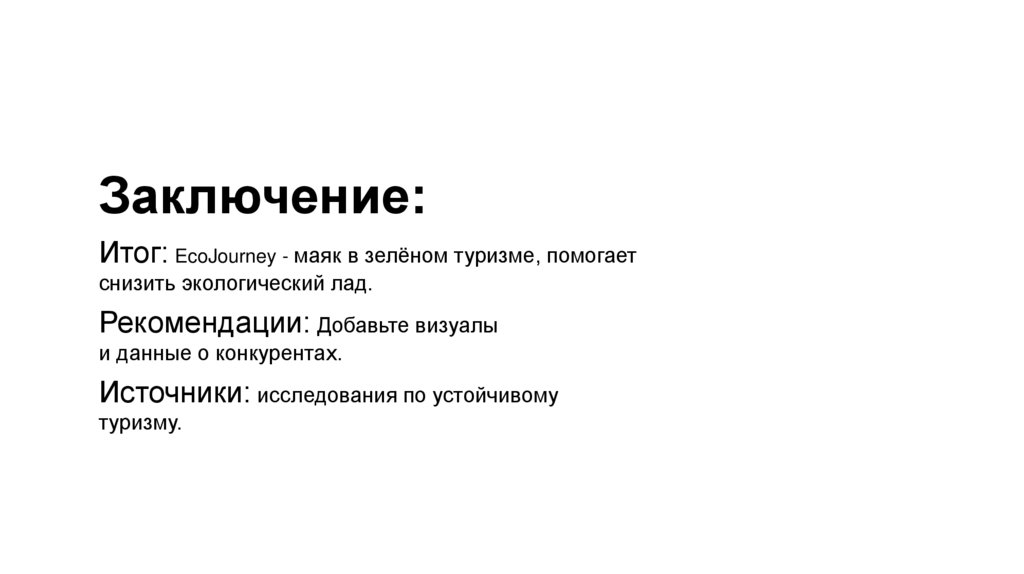 Заключение:Итог: EcoJourney - маяк в зелёном туризме, помогает