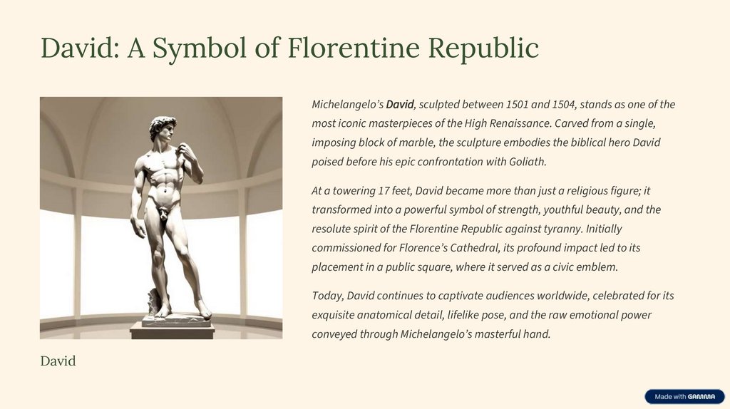 David: A Symbol of Florentine RepublicMichelangelo’s David, sculpted between 1501 and 1504, stands as one of the