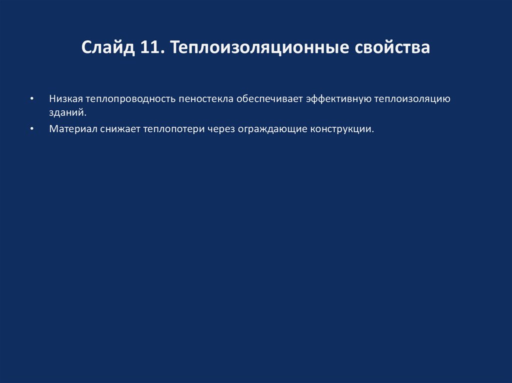 Слайд 11. Теплоизоляционные свойстваНизкая теплопроводность пеностекла обеспечивает эффективную теплоизоляцию
